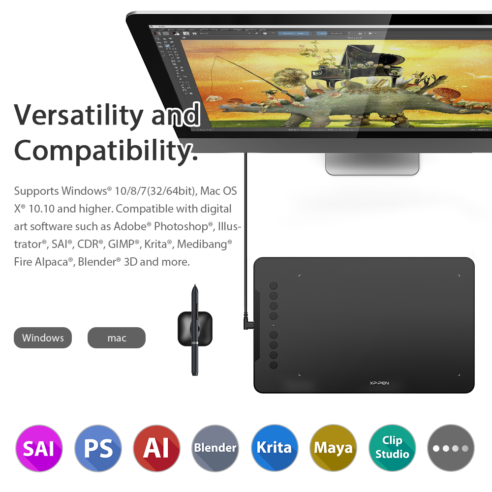 Compatible with Windows 10/8/7, Linux (Detailed versions), Mac OS X 10.10 and above. Also compatible with many major designer software such as Photoshop, SAI, Painter, Illustrator, Clip Studio, and more.